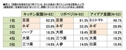 そのほか、暑い夏にも育てやすい「オクラ(10.0%)」「ゴーヤ(8.5%)」、一度植えると数年収穫ができる多年草の「ニラ(8.0%)」、収穫の達成感が大きい「大根」「たまねぎ」、生育が早く育てやすい「小松菜」(いずれも7.5%)が続いています。
