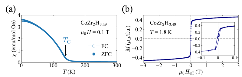 図2. (a) CoZr2H3.49の磁化率の温度依存性。(b) 磁化の磁場依存性。