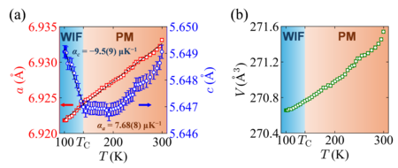 格子定数の温度依存性を得るために、各温度で測定した放射光粉末X線回折パターンに対してそれぞれリートベルト解析[11]を行いました。図4(a)にリートベルト解析によって得られた格子定数aとcの温度依存性を示します。格子定数aは観測した温度域で正の熱膨張を示します。一方で格子定数cはキュリー温度以上の温度域(常磁性相:PM)で正の熱膨張を示しますが、キュリー温度以下の温度域(弱い遍歴強磁性相:WIF)では負の熱膨張を示すことがわかります。つまり、CoZr2H3.49の格子定数cの温度依存性はキュリー温度を境に変化し、弱い遍歴強磁性相でのみc軸負熱膨張が実現するということです。水素を含まないCoZr2が示すc軸負熱膨張は低温から高温まで幅広い温度域で観測されるのに対して、CoZr2H3.49のc軸負熱膨張はキュリー温度以下でのみ観測されることから、CoZr2H3.49のc軸負熱膨張の機構はCoZr2の場合と異なり、強磁性転移によって駆動される、いわゆる相転移型に分類されると考えられます。