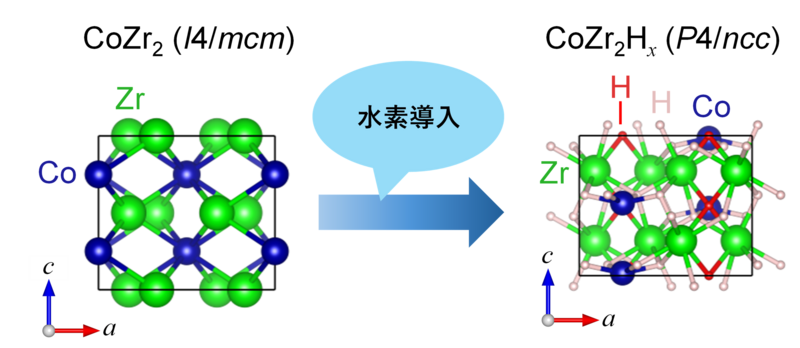 図1.CoZr2の結晶構造 (I4/mcm)とCoZr2Hx (P4/ncc)の結晶構造。