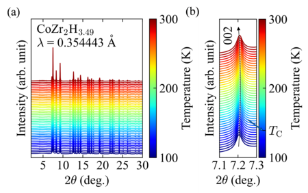 そこで本研究では、水素を導入したCoZr2H3.49に対して放射光X線回折測定をキュリー温度以下の温度域まで行い、熱膨張特性の評価を行いました。放射光粉末X線回折測定[8]は大型放射光施設SPring-8[9]のBL13XUビームラインで実施しました。