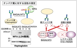 左:タンパク質上の糖鎖に対するB4GALNT3の活性の測定。糖タンパク質の一つであるHaptoglobinを、精製したB4GALNT3もしくはN252Aと反応させ、合成されたLDN糖鎖をWFAと呼ばれるタンパク質で検出した。下の図は、Haptoglobinのタンパク質を検出しており、同量のHaptoglobinが反応液中に存在していることを示す。