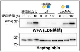 B4GALNT3とHaptoglobinの反応液に、硫酸化された短い糖鎖であるL4、もしくは硫酸化されていない糖鎖であるLacNAcを添加した。B4GALNT3により形成されたHaptoglobinの上のLDNは、WFAタンパク質により検出した。