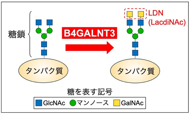 ・B4GALNT3は、タンパク質に付いた糖鎖の末端にLDNと呼ばれる構造を作る酵素で、血中のタンパク質濃度の調節や骨の形成に関わっています。