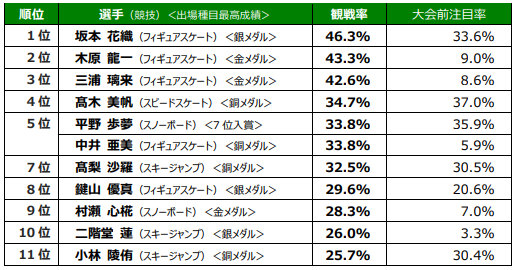 1位は前回2022北京大会の銅メダリストで、前大会に引き続き団体戦にも出場した坂本花織選手でした。4位の髙木美帆選手、5位の平野歩夢選手、7位の髙梨沙羅選手、8位の鍵山優真選手、11位の小林陵侑選手も、「注目率」(大会前調査N=10,000)が20%を超えていた注目度の高い選手でした。