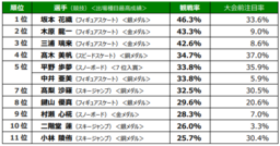 一方で、2位・3位の「りくりゅうペア」こと木原龍一選手と三浦璃来選手、同率5位の中井亜美選手、9位の村瀬心椛選手、10位の二階堂蓮選手の大会前注目率は10%未満であり、本大会での活躍により、ニュースやダイジェストを含む放送視聴が高まったと考えられます。