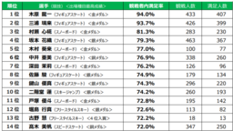 観戦した人の中で何人が満足したかを「観戦者内満足率」として算出しました。なお、観戦人数の下限は10人です。