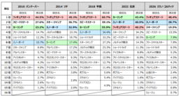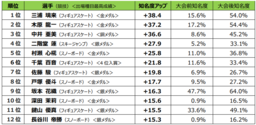 30ポイント以上アップしたフィギュアスケートの3選手をはじめ、15ポイント以上アップした選手はほぼ全員が「メダリスト」でした。期待を上回る活躍によってメダルを獲得し、メディアでも大きく取り上げられた選手の知名度が急上昇しました。
