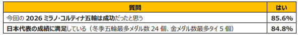 夏季と冬季の違いがあるため単純な比較はできませんが、本研究所が2024パリ五輪後に実施したアンケートでは、大会成功の肯定率が55.3%に留まったのに対し、今回は回答者(N=1,000)の85.6%が「成功」と回答しました。その背景には日本代表の活躍と過去最高の競技成績があることも大きく関係していると考えられます。