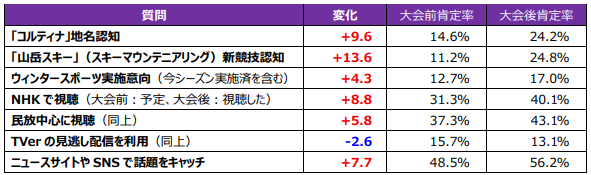 メディア関連では、NHK・民放・ニュースサイトやSNSともに大会前の高い肯定率をさらに上乗せしたことが裏付けられ、大会の盛り上がりによってライト層や無関心層が掘り起こされたことが明らかとなりました。