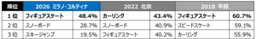調査を開始してから3大会連続で1位はフィギュアスケートでした。浅田真央選手と羽生結弦選手が活躍していた時代です。2022北京大会においても4個のメダル(銀2、銅2)を獲得しましたが、絶対的王者ショーン・ホワイト選手との一騎打ちを制した平野歩夢選手を擁するスノーボードの躍進と、2018平昌大会で銅メダル、2022北京大会で銀メダルと成長を遂げ、チーム内コミュニケーションが視聴者の強い共感を生んだカーリングに押されて3位となりました。しかし今大会、りくりゅうペアの金字塔を筆頭に、団体・個人でも好成績、さらにはチームワークの良さも好感を呼び、再び首位に返り咲きました。スノーボードは2位をキープし、スキージャンプは2014ソチ大会以来の高順位3位となりました。