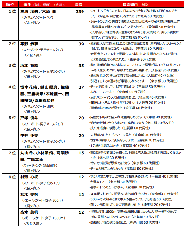 最も感動したシーンについて、8位入賞以上の48件(金5、銀7、銅12、4位6、5位1、6位8、7位4、8位5)を対象に選んでもらいました。1位は圧倒的な票数で「りくりゅうペア」。2位の平野歩夢選手をはじめ、金メダル以外のシーンも複数選ばれました。投票の決め手として、ペアや団体種目の結束力、選手の人間性を挙げる回答者もいました。