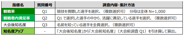 全121選手を分析対象として実施しました。指標名と調査内容・集計方法の対応は下表の通りです。「競技を視聴」にはニュースやダイジェストでの視聴も含みます。