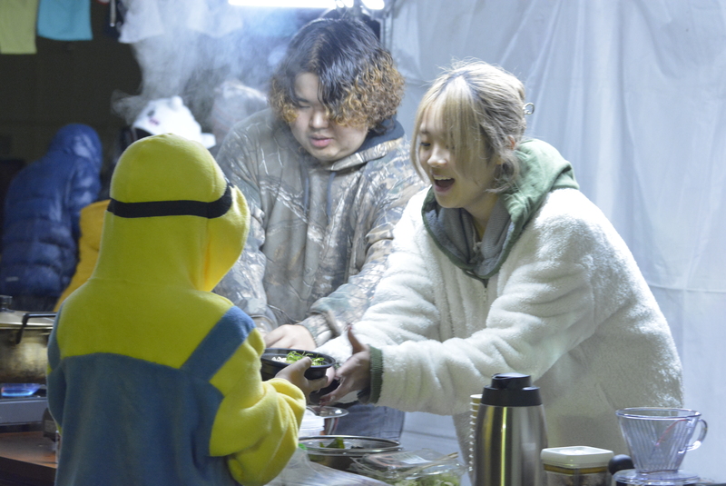 そこで、ASURAは昨年から、事前予約が可能な有料の休憩スペースを設け、仮設テントにテーブル・イスとお食事を温める七輪も設置しました。