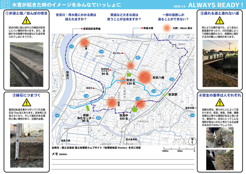 最近では、 久留米市安武町における水害防災ワークショップにも参画し、危険になりそうな箇所を踏査したり、避難ルートなどをまとめた資料の作成を行うなど、建築やまちづくりを学ぶ学生の強みを活かして貢献しました。