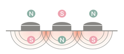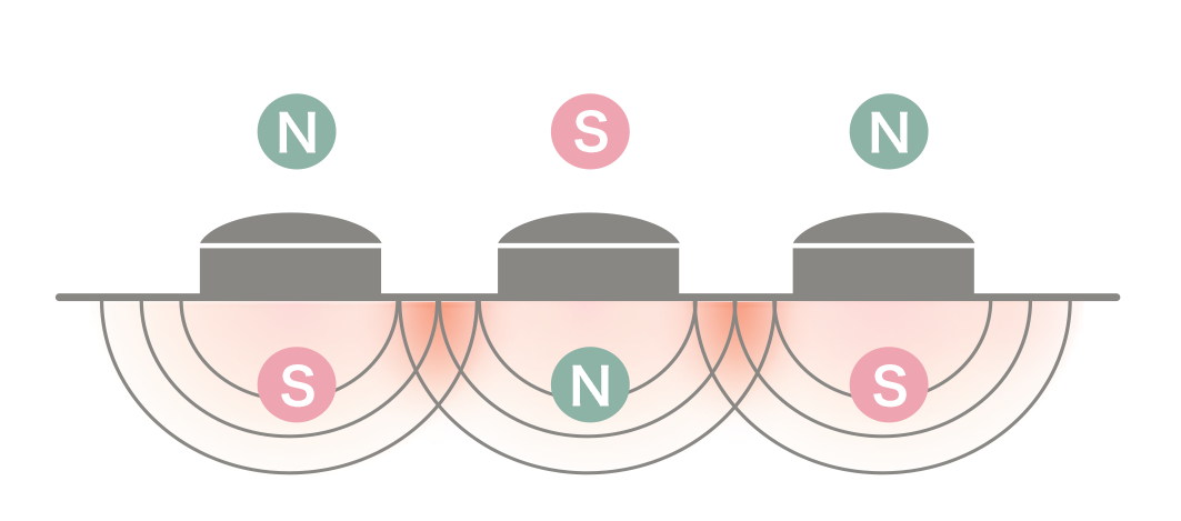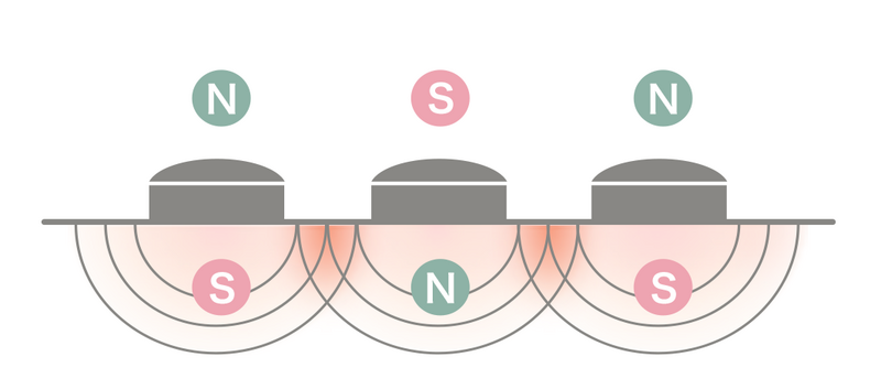 血行を改善する磁気の効果を、より最大化するためにコラントッテ独自のN極S極を交互配列で磁石を配置。磁力が繋がることで点ではなく面でより広範囲で磁力の効果が得られます。磁気治療器のパイオニアであるコラントッテが25年以上かけて培ってきた磁気研究が活かされています。