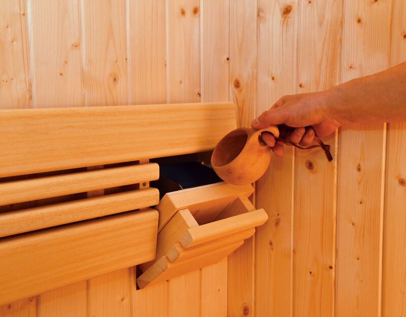 サウナヒーターがベンチ下に格納されているため広々した安全な室内でお子様も安心してサウナ入浴ができます。背もたれの専用ハッチからロウリュするとマイルドな蒸気がふりそそぎ、やわらかな空間が演出されます。