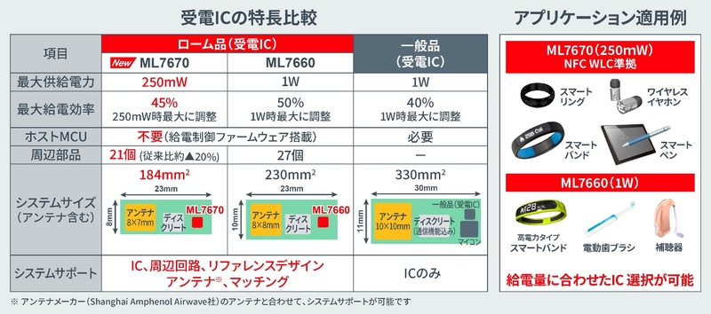 ローム株式会社(本社:京都市)は、スマートリングやスマートバンドなどの小型ウェアラブル機器やスマートペンなどの小型周辺デバイス向けに、近距離非接触通信を行う無線技術(NFC)に対応したワイヤレス給電ICチップセット「ML7670(受電)」「ML7671(送電)」を開発しました。