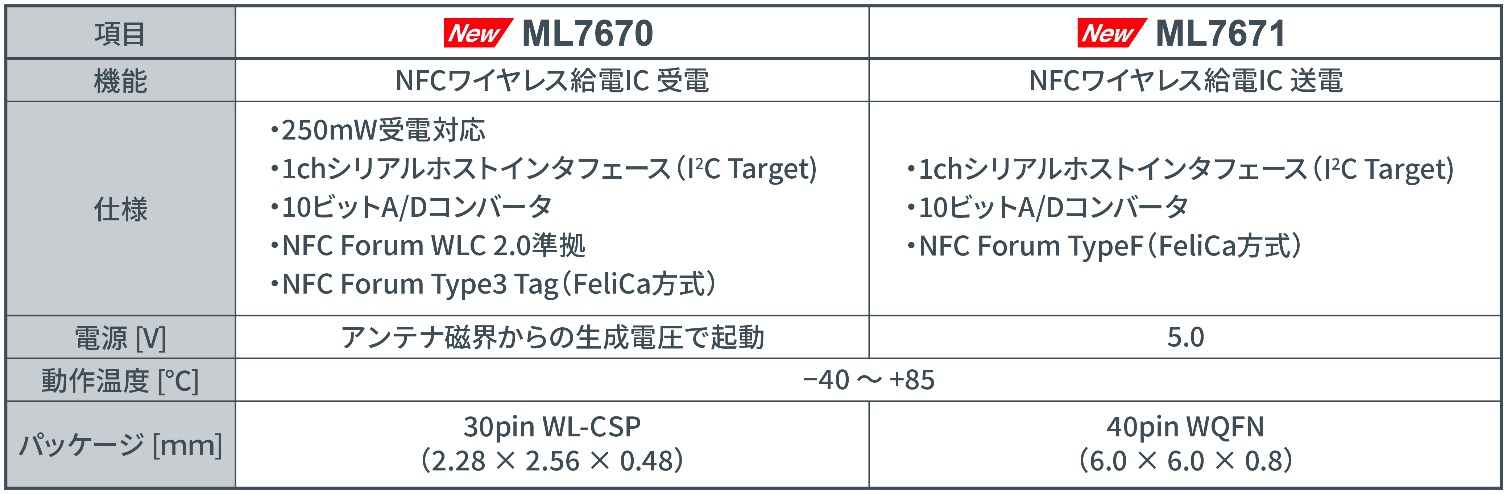 受電IC「ML7670」は、2.28×2.56×0.48mmという業界最小クラスのコンパクトサイズを維持しつつ、給電量が250mWの低出力領域での動作で最大給電効率45%を実現します。新チップセットでは、コイル整合、整流回路、スイッチングデバイスの損失低減といった要素の最適化により、同等クラス製品の効率水準を上回る性能を実現している点が大きな特長です。