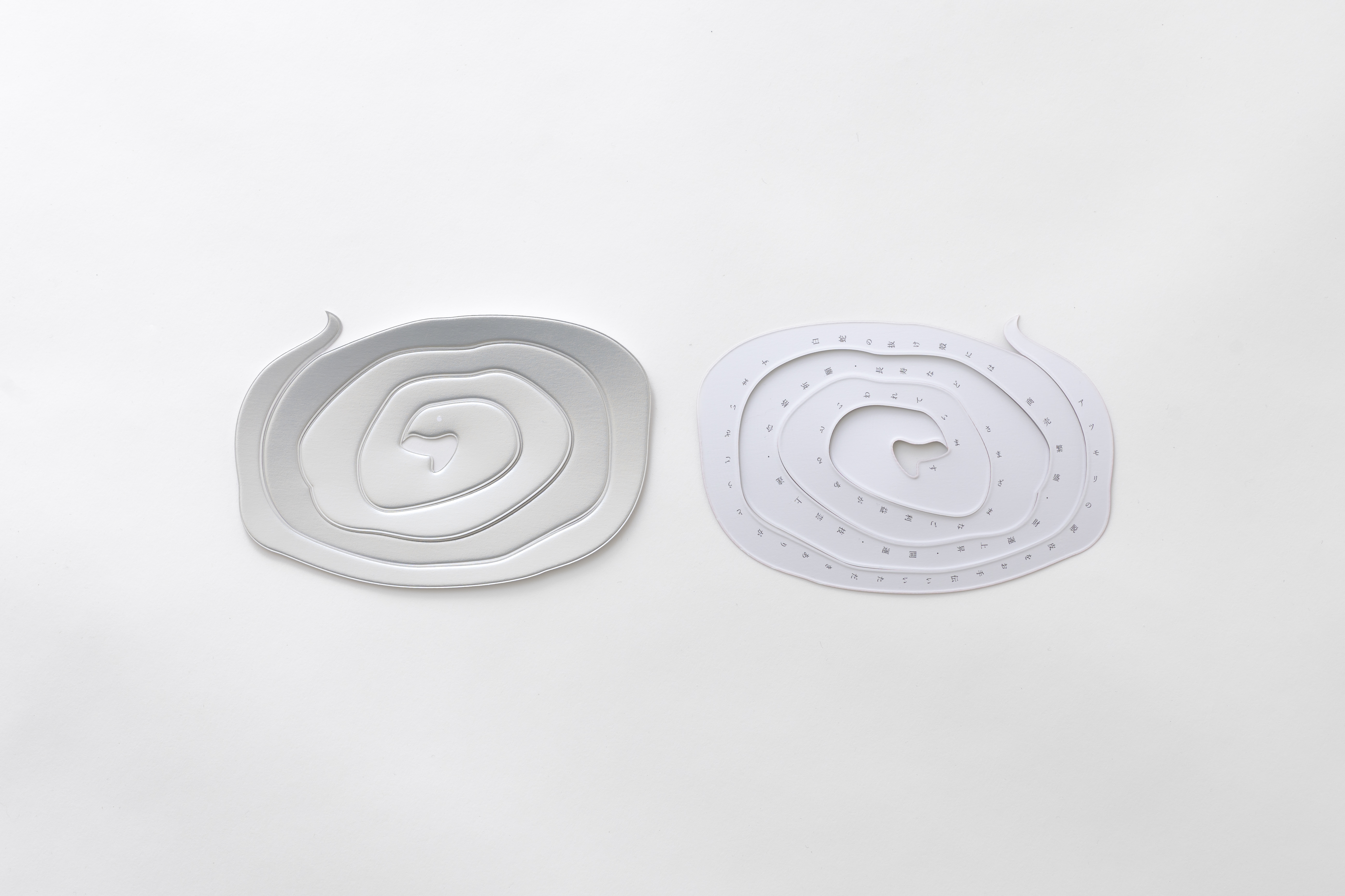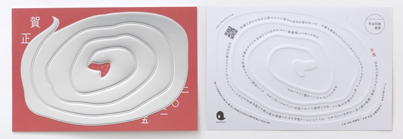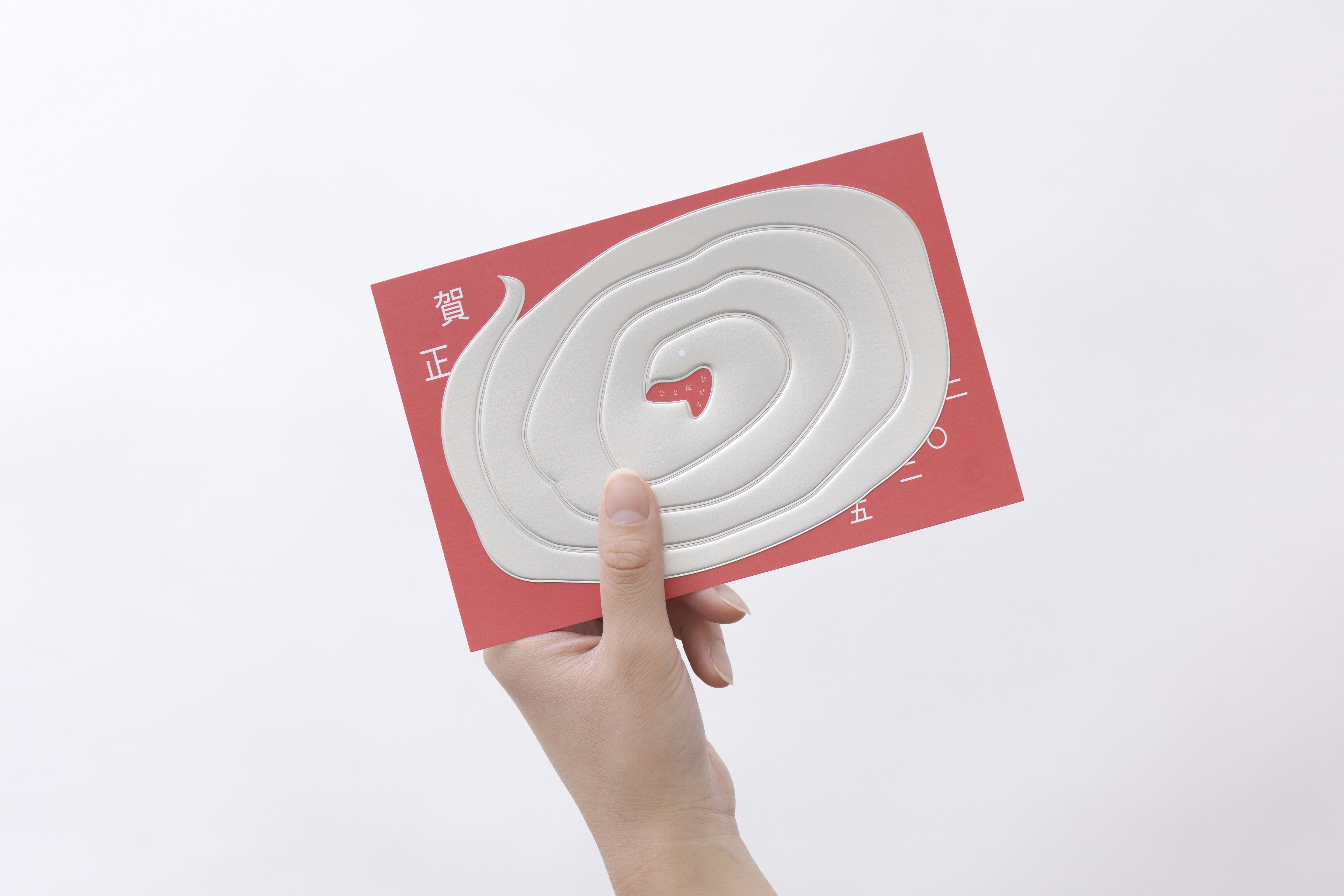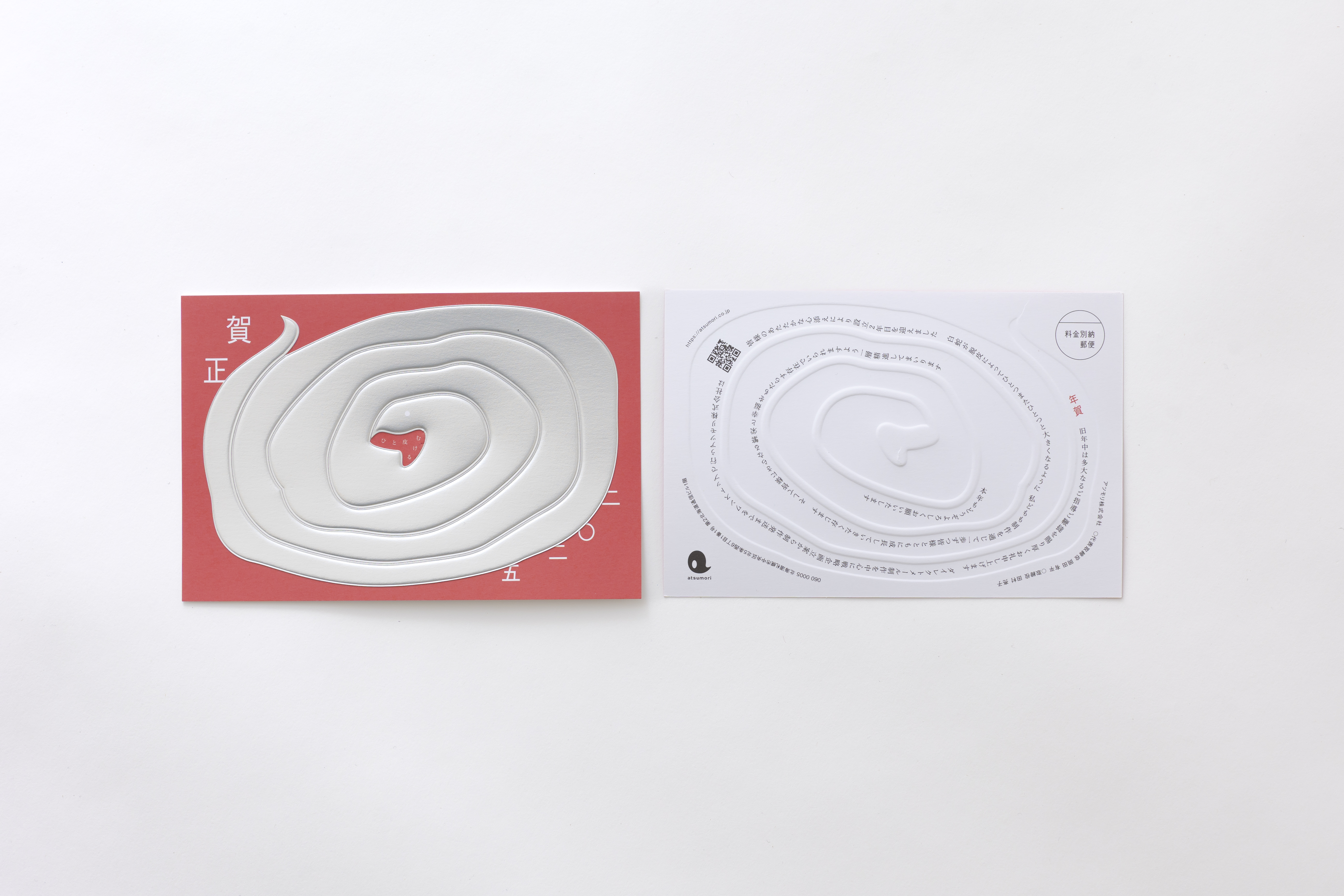 「会社として一回り大きく脱皮すること」をテーマに、蛇の皮を実際にベリベリと剥がせる年賀状を制作。剥がした皮(抜け殻)は1本の長い紐状になり、裏面には遊び心のある「回文メッセージ」を記載。
