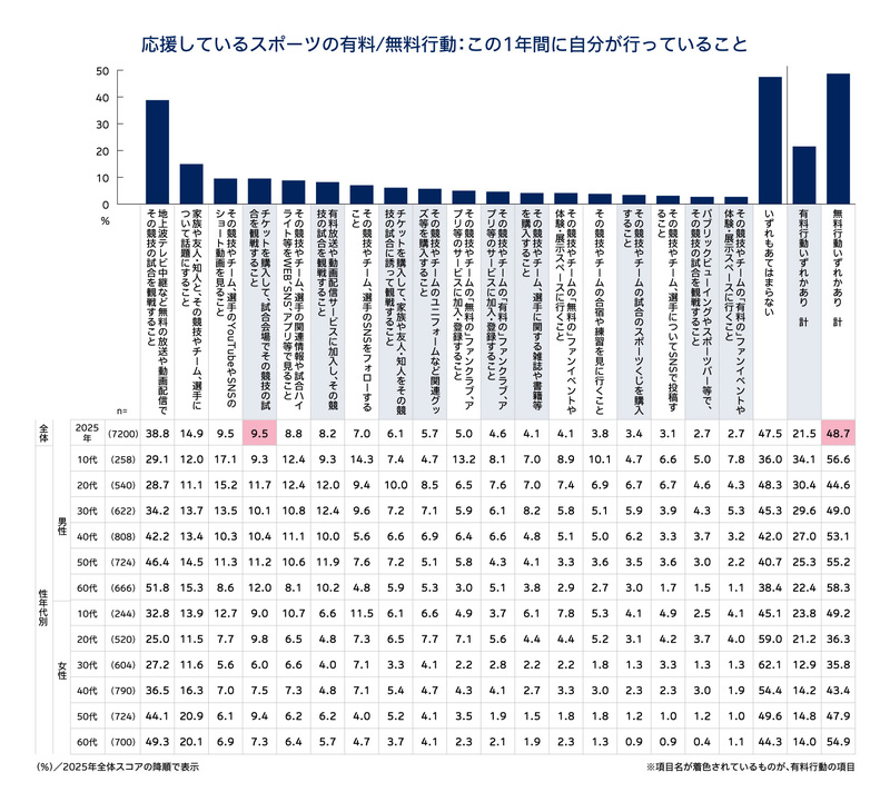 ・スポーツの応援行動のうち、「無料の行動」を行っている人は約5割(48.7%)で、有料行動を行っている人は約2割(21.5%)。有料行動の中で最も高いのは「会場観戦」だが、全体の1割弱にとどまる。【図表8】