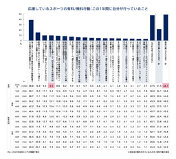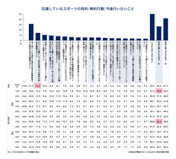 スポーツ応援は無料行動が中心(48.7%)で有料行動は21.5%にとどまるものの、会場観戦は9.5%(この1年間に行っている)から14.3%(今後行いたい)へ増加が期待される。特に10代の有料行動意向が高い。