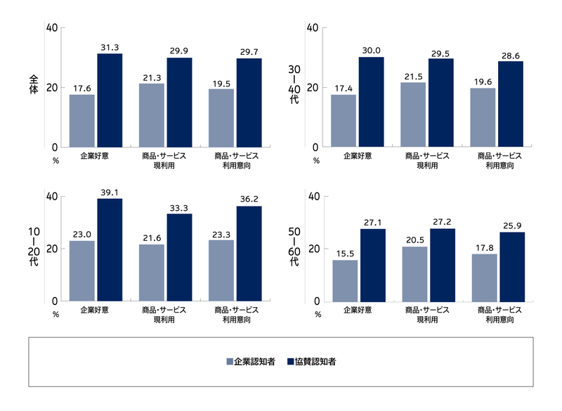 ・ある企業群を認知している人と、それらの企業が主要な大会・リーグなどに協賛していることまで認知している人では、その企業に対する「好意」や商品・サービスの「利用意向」などにおいて、後者の方が約10ポイント高くなり、10~20代ではその差が顕著になった。【図表10】