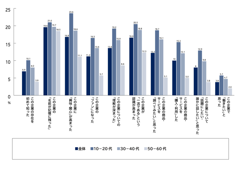 ・企業が大会やリーグなどに協賛している事実を知った後の気持ちの変化には、「企業名が記憶に残った」「興味関心が高まった」「一流であるという認識が高まった」などがあり、10~20代では「この企業で働きたい」が他の年代よりも高くなった。【図表12】