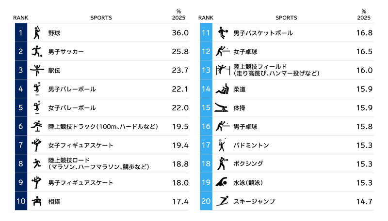 競技の興味関心は野球が最も高く、男子サッカー、駅伝、男女バレーボールなどが続く。「情報を見聞きする選手」では、全競技の中でも、大谷翔平・山本由伸・佐々木朗希といったメジャーリーガーが上位を占め、野球の競技としての人気をけん引。