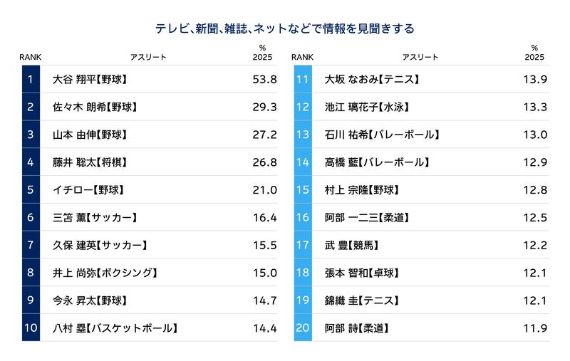 ・「情報を見聞きする選手」 では、大谷翔平が最も多く、山本由伸、佐々木朗希が続き、上位3人はいずれも現役メジャーリーガーとなった。SNSを含め、日常的に情報に触れる機会が多い選手の存在が、競技への興味関心を後押ししている。【図表2】