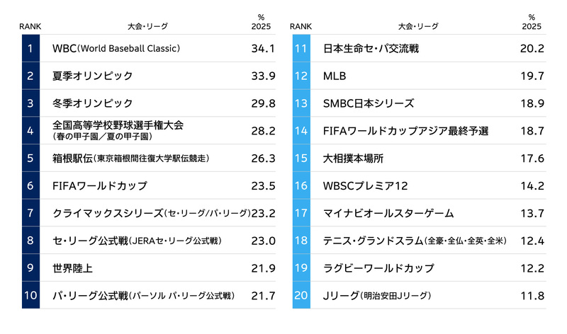・大会・リーグの興味関心は、WBC(34.1%)に、夏季オリンピック(33.9%)が続き、冬季オリンピック(29.8%)も3割近く支持されるなど、国際的なメガイベントへの関心の高さが際立つ結果に。次いで高校野球(春/夏28.2%)や箱根駅伝(26.3%)などの国内独自の学生スポーツ大会の関心が高い。【図表3】