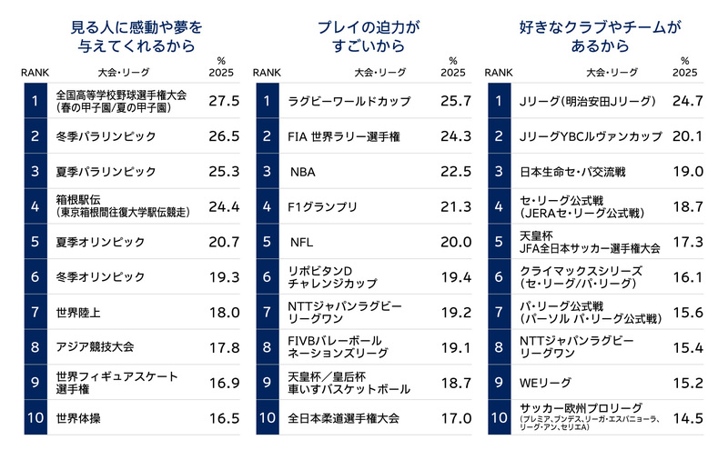・興味の理由をみると、大会・リーグごとに刺さるポイントが異なる。たとえば「見る人に感動や夢を与えてくれる」では高校野球(春/夏)、箱根駅伝に加えて、夏季/冬季パラリンピックが上位に挙がり、社会的な注目度やストーリー性が関心を後押ししている可能性が示唆される。また「プレイの迫力がすごい」ではラグビーワールドカップ、FIA 世界ラリー選手権、NBA(National Basketball Association)が挙がり、競技特性や最高峰のプレイへの期待も関心の入り口となっている。【図表4】