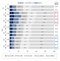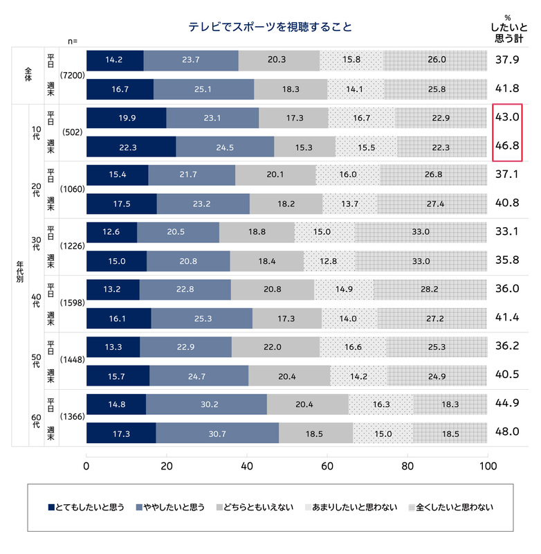 スポーツに関する行動意向では、視聴(無料/有料)は平日/週末の差が小さい一方、「スポーツをする」は週末志向が高い。また、スポーツを見る・する両面で10代の意向が高く、スポーツへの関心の高さがうかがえる。