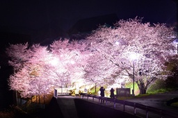 見頃にはライトアップが行われ、夜桜も楽しめます。桜の植樹やライトアップは美松ゴルフセンター様のご厚意によるもの。地域の支えがあってこそ守られている春景色です。