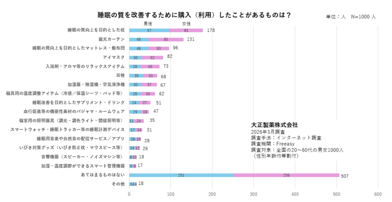 また、「睡眠の質を改善するために購入(利用)したことがあるもの」に関しては、1位が「睡眠の質向上を目的とした枕」(178人)、続いて「遮光カーテン」(131人)、「睡眠の質向上を目的としたマットレス・敷布団」(96人)、「アイマスク」(82人)、「入浴剤・アロマ等のリラックスアイテム」(73人)という結果です。