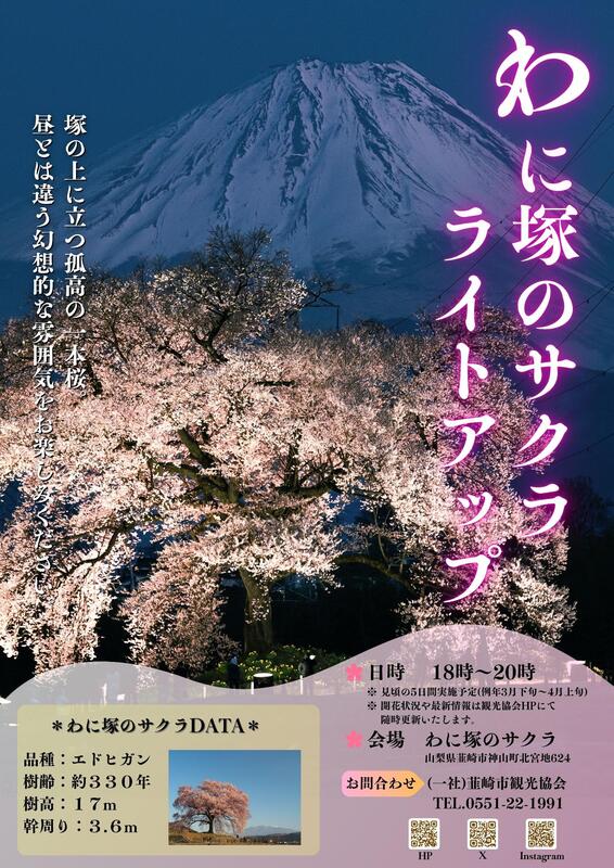 山梨県韮崎市神山町にある一本桜「わに塚のサクラ」のライトアップを、桜の見ごろに合わせて実施します。