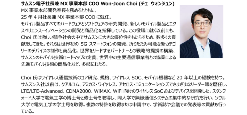 サムスン電子社長 兼 MX事業本部COO Won-Joon Choi(チェ ウォンジュン)