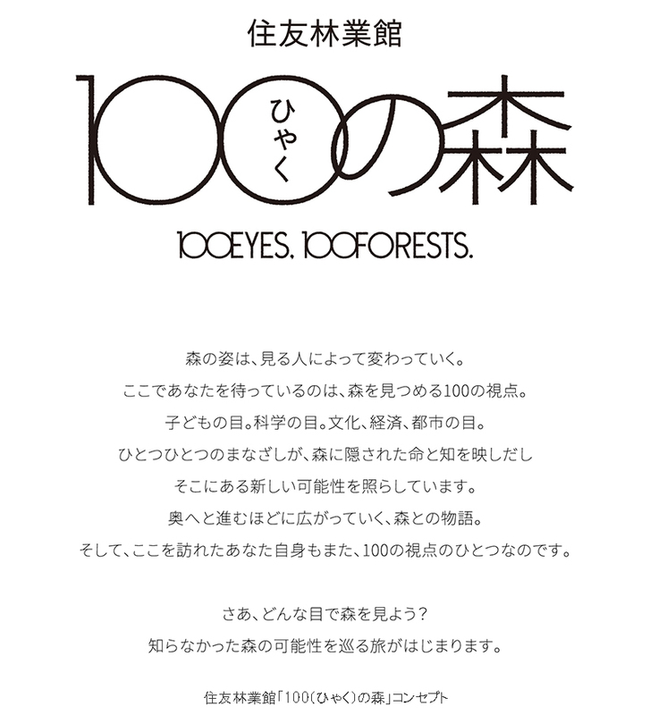 住友林業館「100(ひゃく)の森」は「100EYES, 100FORESTS.」をコンセプトに、木と森を多角的な視点から見つめる体験を提供します。住友林業グループは1691年の創業以来、「木」を軸に事業を展開し、森を守ることと、自然資本として活用すること、その両方に多様な視点で取り組んできました。「100EYES, 100FORESTS.」には、「森の姿は、見る人によって変わっていく、多くの可能性を秘めている」というメッセージが込められています。