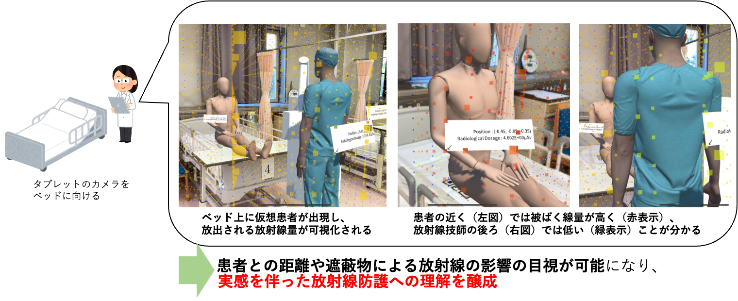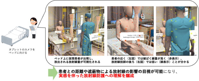 (注1)散乱線:X線が物質に当たって進行方向やエネルギーを変えて広がる二次放射線。本研究のARでは散乱線量の空間分布を色分け表示とタブレット端末の位置での線量を表示し、立ち位置の安全性を学習した。