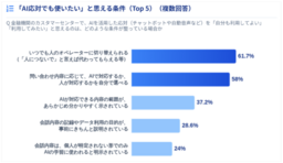 逆に、「AI応対でも利用してよいと思える条件」としては、「いつでも人のオペレーターに切り替えられる」、「AIか人か、自分で選べる」、「AIが対応できる範囲があらかじめ分かりやすく示されている」、「会話内容の記録・データ利用目的が事前に説明されている」といった項目が多く選ばれ、“コントロール権(選択・切替)”と“透明性”がAI受容のカギであることが示されました。