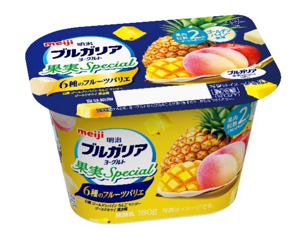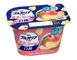 フルーツの風味が引き立つ脂肪0タイプ※4のヨーグルトで、果肉粒数を従来品の2倍配合※5しているシリーズです。季節感、高級感にこだわった「明治ブルガリアヨーグルト 果実Special 白桃」は、白桃果肉と追熟白桃果肉※6を使用し、旬の白桃を想起させる果汁感と甘さのあるあじわいをお楽しみいただけます。果肉感や具材感にこだわった「明治ブルガリアヨーグルト 果実Special 6種のフルーツバリエ」は食感が引き立つゴールデンパイン果肉※7をメインに、白桃果肉、マンゴー果肉、りんご果肉、黄金桃果汁、ゴールデンキウイ果汁の6種類のフルーツのあじわいをお楽しみいただけます。満足感のある180gで、食感や食べ応えを求める方にオススメです。