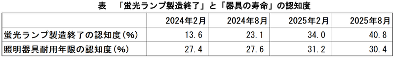 「蛍光ランプ製造終了」と「器具の寿命」の認知度