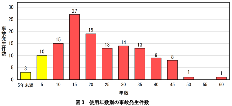 「蛍光灯器具の事故」205件のうち、蛍光灯器具の使用年数が推定できた133件について、「使用年数別の事故発生件数」を図3に示します。使用年数が10年を超えていた事故の割合が約9割(120/133件)を占めています。