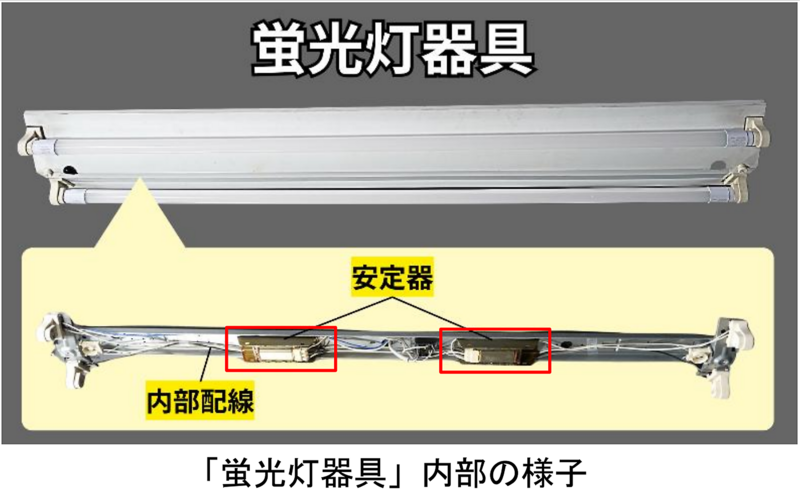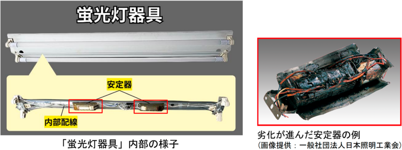 蛍光灯器具は、単なる「ランプの取付け台」ではなく、安定器や内部配線などの電気部品を内蔵した「電気製品」であるため、外観に異常が見られなくても内部では劣化が進行している場合があります。特に、器具内の安定器は長年の使用により絶縁性能が低下することがあり、その結果、発煙や発火などの事故に至るおそれがあります。