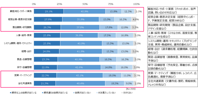様々な業務でAI導入効果、顧客対応・サポート業務は29.1%が「期待以上の効果」