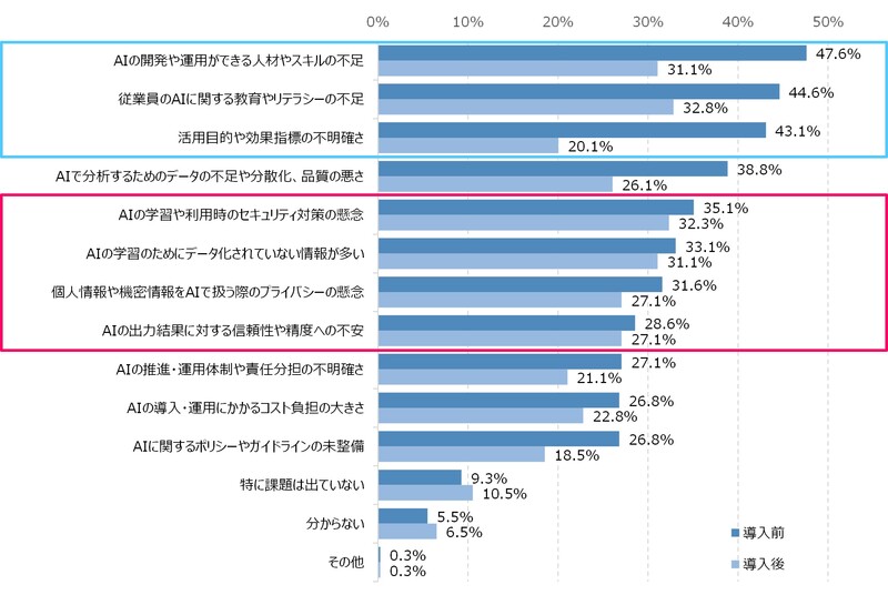 AI活用を進める上で、導入前と後でそれぞれどのような課題が挙がったかを質問したところ、導入前後で大きく課題感が変わるものと、導入後も変わらないものに結果が分かれました。