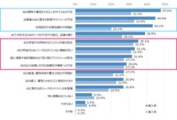 活用目的や効果指標の不明確さ、人材/スキルの不足や教育等は導入後に課題解消(または課題感低下)している一方で、特に、AI学習用データの取り扱いや出力結果の精度や信頼性等、入出力データに関する懸念は導入後も課題として残り続けており、継続的な課題解決のための取り組みが必要になると考えられます。