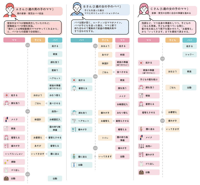 朝はパパが家事・育児を担当することで、ママに自由な時間が生まれ、身支度や出勤準備にも余裕が生まれます。その分、パパは夜に自由時間を確保するなど、無理のないバランスづくりが継続のポイントのようです。