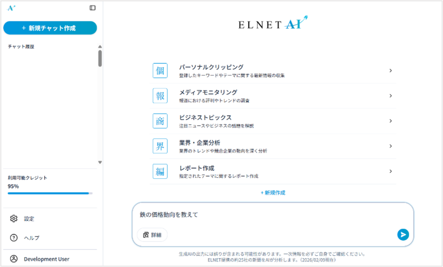 本サービスは、ELNETが保有する豊富な新聞記事データを活用し、生成AIによってトピックスの整理・分類・レポート作成を行うサービス※5です。