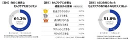 そこでセルフケアとの接し方を聞くと、61.5%が「セルフケアに関する情報の取捨選択が難しい」と感じ、43.8%が「良いといわれるセルフケアを試すなど試行錯誤を繰り返す」、 40.8%が「他人がしっかりセルフケアをしている姿を見てひけめに感じる」と回答しています。セルフケア情報が多過ぎて、あれもこれもと試行錯誤を繰り返し、ついつい他人と比べ自分はできていないとコンプレックスを感じているようです。